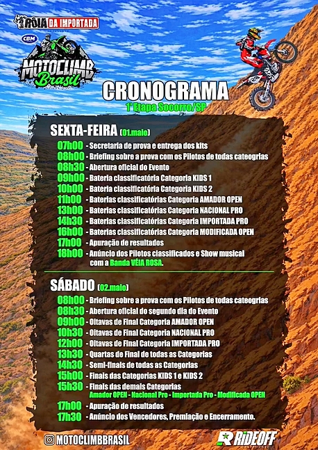 Além das categorias Amador Open, Nacional Pró e Importada Pró, a temporada traz novidades importantes. Entre elas estão as categorias Kids 1 e Kids 2, voltadas para crianças, e a estreia da Modificada Open, que abre espaço para motos com motores e balanças maiores, algo inédito em competições brasileiras da modalidade. O formato também promete movimentação intensa: na sexta-feira acontecem os Treinos Oficiais e as Classificatórias, enquanto o sábado será reservado às semifinais, finais, cerimônia de premiação e encerramento.
