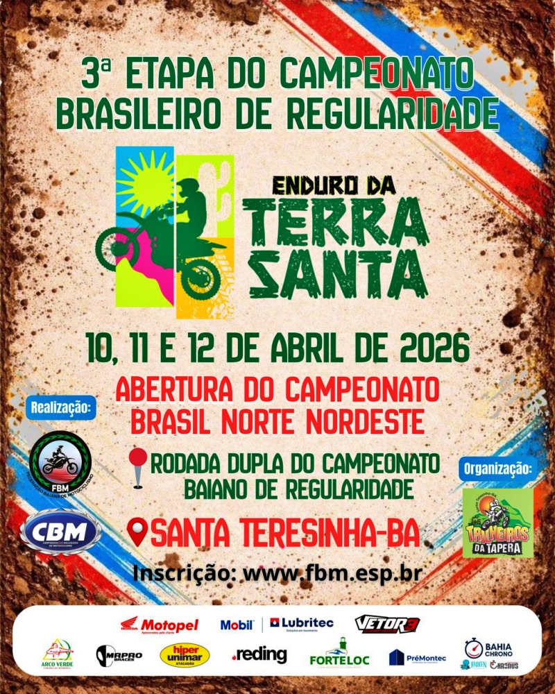 O cenário do fora de estrada nacional ganha um novo destino estratégico em abril. Estão abertas as inscrições para a terceira rodada do Campeonato Brasileiro de Enduro de Regularidade 2026, que também contará como rodada dupla do Campeonato Baiano de Regularidade (sábado: 3ª e 4ª etapas; domingo: 5ª e 6ª etapas) e como prova de abertura do Campeonato Brasil Norte-Nordeste. O município de Santa Teresinha, na Bahia, será o anfitrião da inédita competição, batizada de Enduro da Terra Santa.